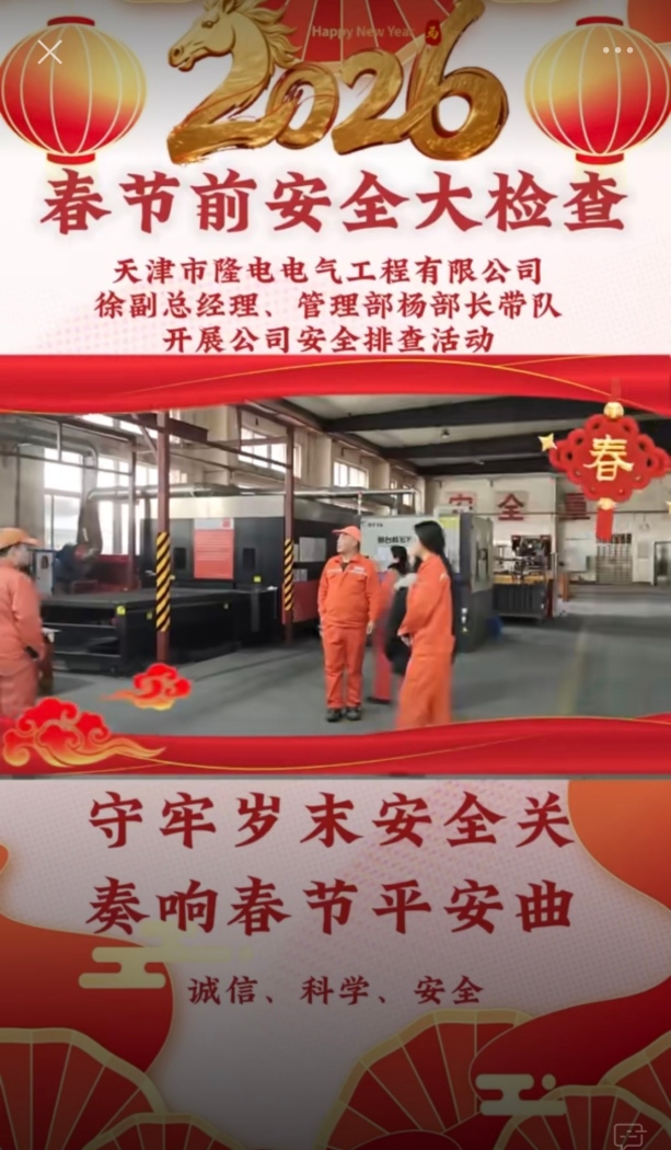 春節(jié)將至,為切實做好節(jié)日期間安全生產(chǎn)工作,隆電電氣開展節(jié)前安全大檢查。重點對配電設(shè)備、線路連接、接地絕緣、消防設(shè)施、應(yīng)急通道、用電用氣等進行全面排查整治,做到隱患早發(fā)現(xiàn)、問題早整改、責任全落實。嚴格落實節(jié)日值班值守制度,嚴防安全事故發(fā)生,確保全體員工度過一個平安、祥和、穩(wěn)定的新春佳節(jié),為節(jié)后順利復工復產(chǎn)筑牢安全保障。