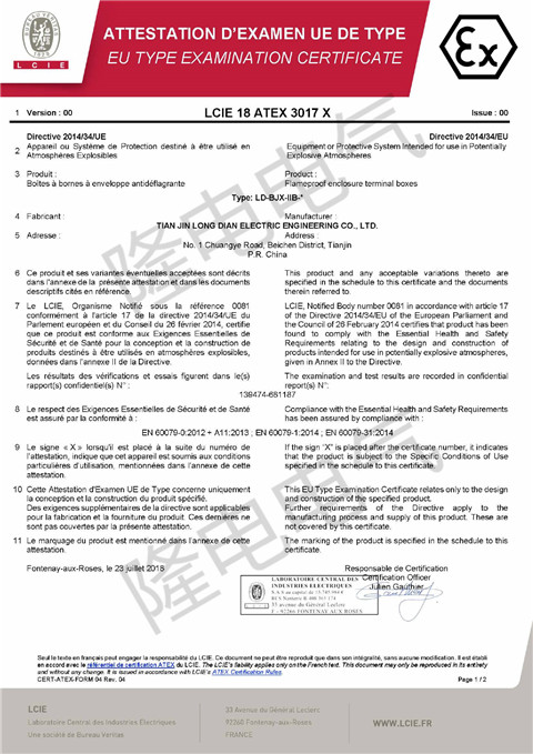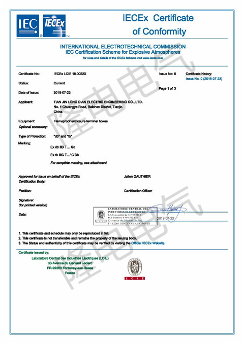 近期,我公司產(chǎn)品隔爆型接線箱(JB d、c),通過歐盟ATEX認證和國際電工委員會IEC認證。通過這兩項認證,標志著隆電電氣的產(chǎn)品制造水平符合世界一流標準,防爆電器的安全性能和功能有可靠保證??蓮V泛應用于歐洲及世界各國的石油、化工、冶金、水處理、建筑等項目中。